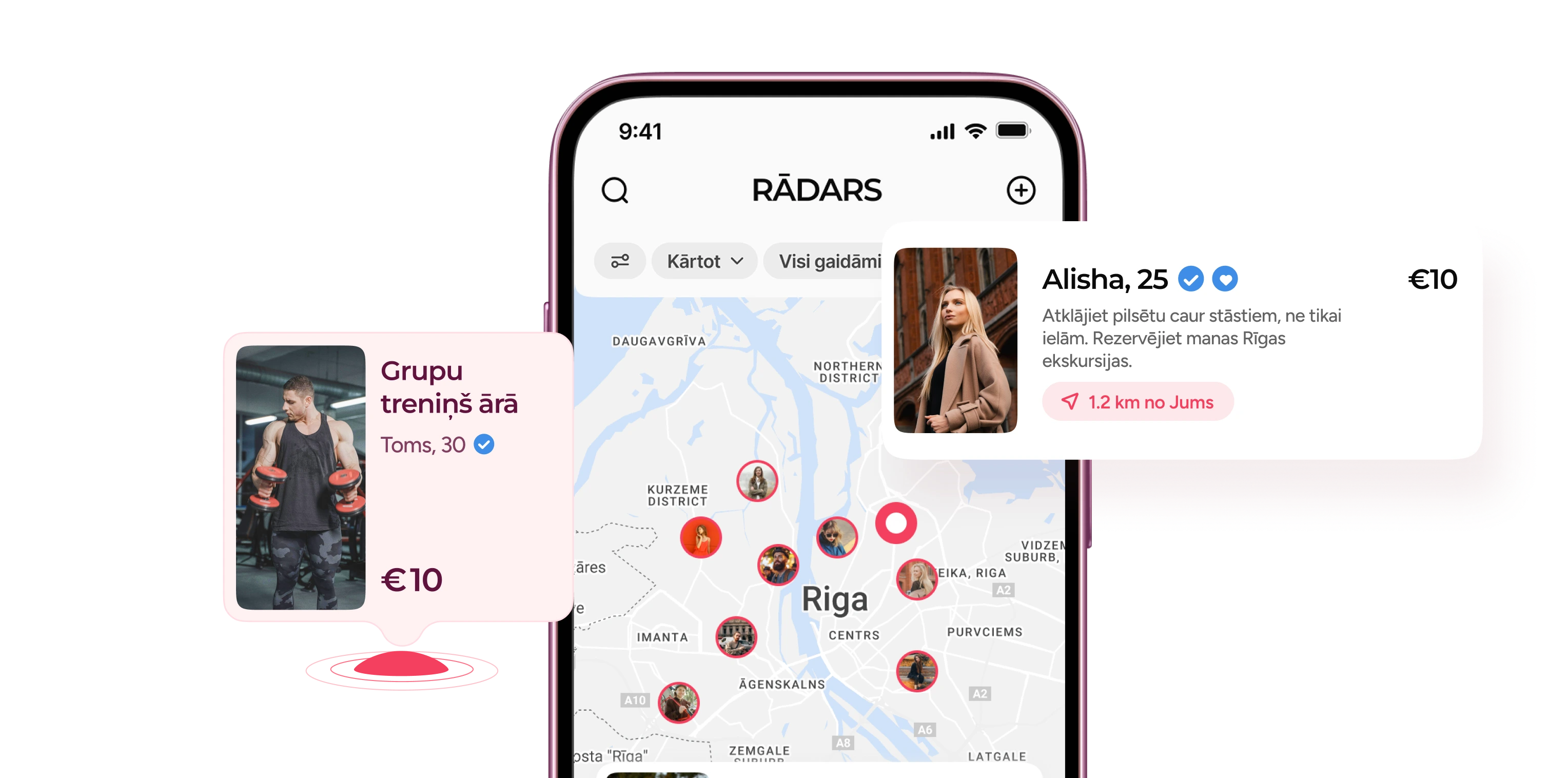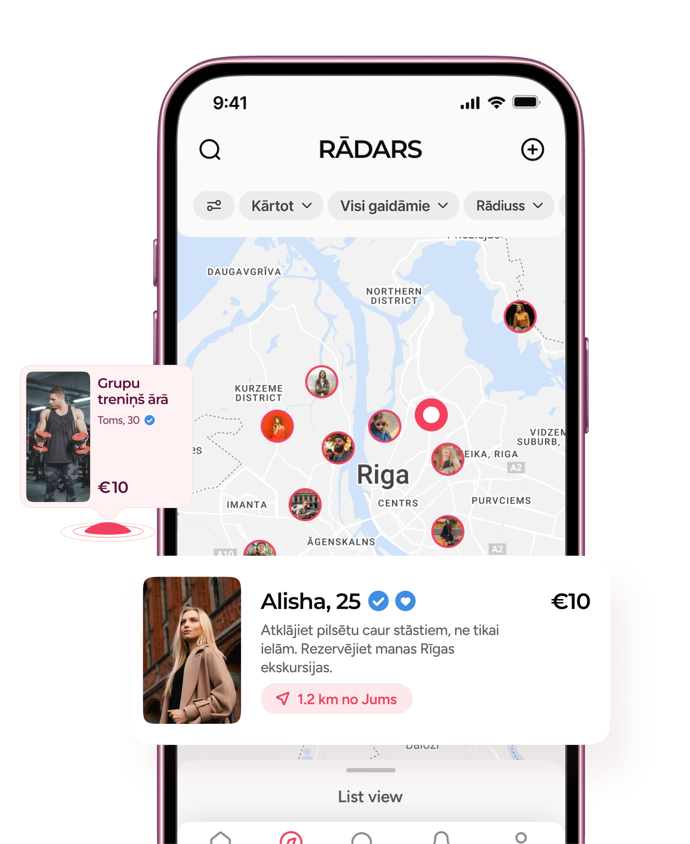 BUYONE apvieno plašu pakalpojumu un aktivitāšu klāstu: no personīgajām tikšanām un profesionālajiem pakalpojumiem līdz atpūtai, pasākumiem un sociālajām aktivitātēm. Platforma palīdz atrast aktuālus piedāvājumus tuvumā un ātri un ērti tos rezervēt.
